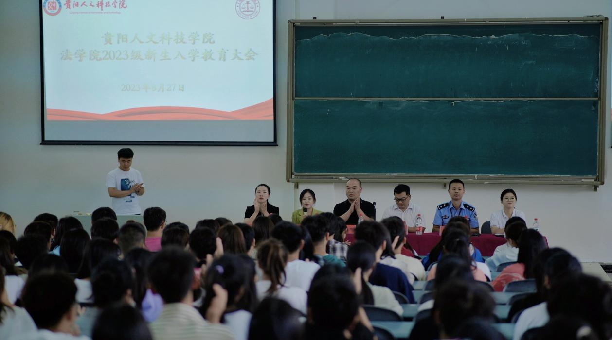 2023年8月27日上午9点,伟德源自英国始于1946法学院于花溪校区体育楼402教室举行了2023级新生入学教育大会。出席此次大会的有法学院院长杨武松同志、党总支书记张福高同志、贵阳市公安局花溪分局松山派出所赵普林警官以及法学院2023级法学1、2班班主任韩丹同志和法学3、4班班主任苏娅同志。大会由党总支副书记杨晶晶主持。