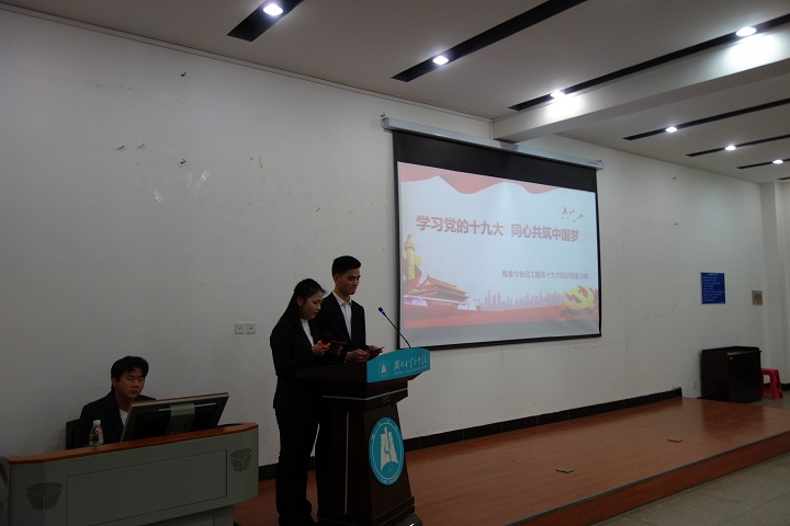 12月20日,粮食与食品工程系学生党支部组织的“学习党的十九大 同心共筑中国梦”党建知识竞赛决赛在报告厅106举行。粮工系党总支副书记冯书祥、辅导员张忠萌、学生党支部组织委员冯诗茗担任评委,由王倩、乐圆主持,参赛选手为通过初赛选拔的中国梦想队、初心依旧队、红旗先锋队、欣欣向荣队、坚定前行队、责任小组队等6只队伍。