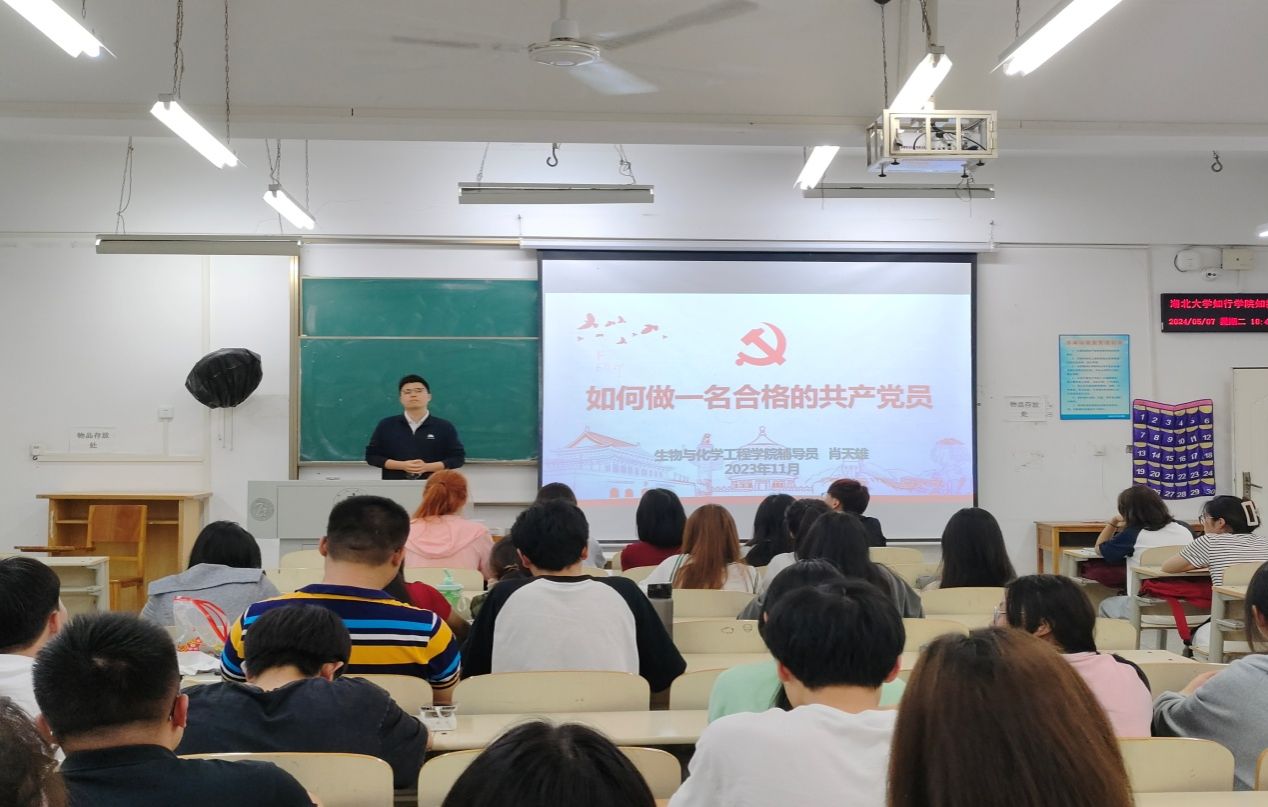 开班仪式结束后,生化学院分团委指导老师肖天雄以“如何做好一名合格的共产党员”为题,为40期入党积极分子讲授了第一节党课。