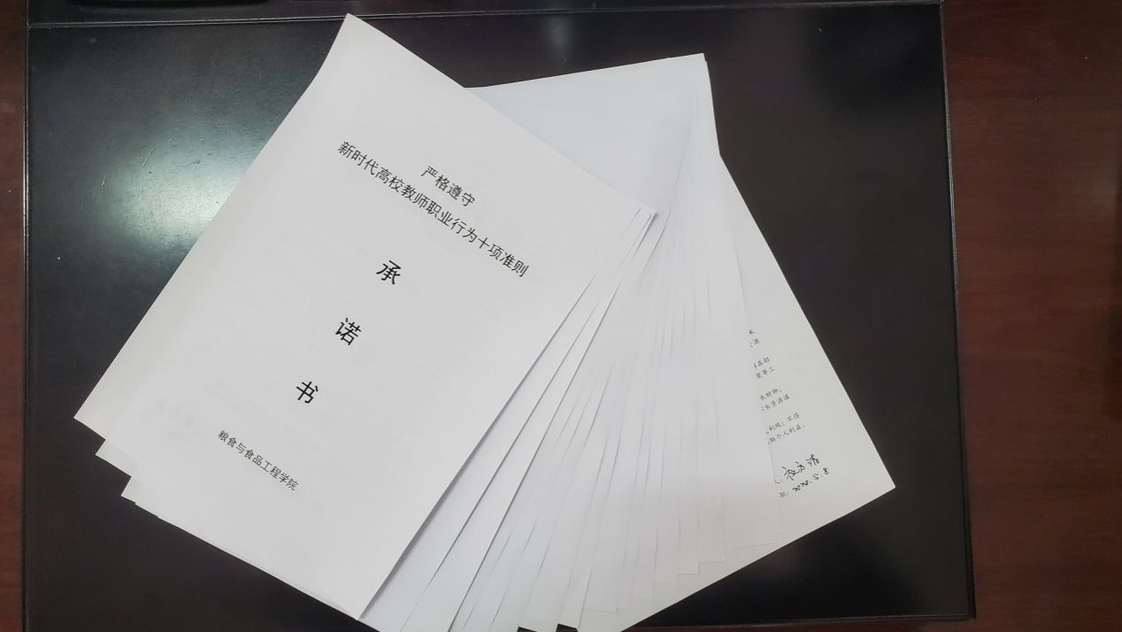 最后,曾仕林老师宣读了《新时代高校教师职业行为十项准则》内容,教师们现场签订了今年会jinnianhui严格遵守《新时代高校教师职业行为十项准则》承诺书。