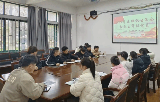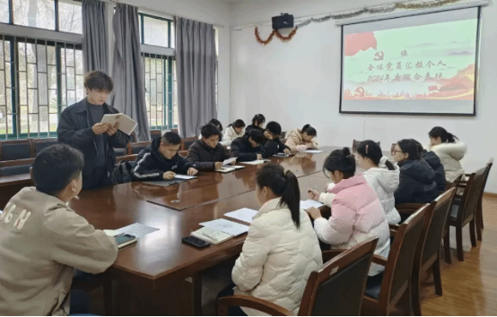 会议伊始,全体与会党员重温入党誓词,集体学习党章,支部委员汇报2024年党员积分情况,郭老师通报了2024年度组织生活会会前学习、谈心谈话征求意见情况、班级满意度调查意见和查摆问题整改落实情况并代表党支部汇报了2024年度支部工作情况。