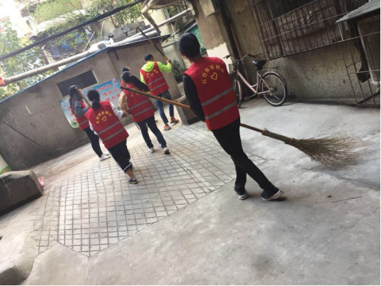 到达袁家社区后,在社区负责人的引导下,我们志愿者一共分成3组,分配在不同的工作岗位上。志愿者们不怕苦,不拍累,拿起扫帚就干。风虽然大,但没有人嫌弃,没有人嫌累,低头苦干,热火朝天。