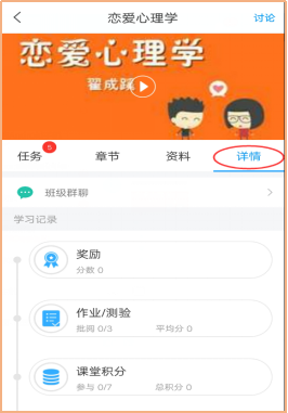 注意:单门课程的学期时间请在“消息”—“通知”里面的本门课程通知查看,学习记录在“详情”中查看。