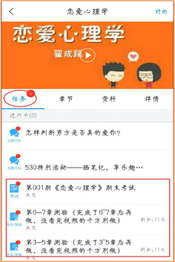 第二步:进入“我的课程”,单击课程名字,并在规定时间内完成视频学习、课程讨论、课程测验和考试;