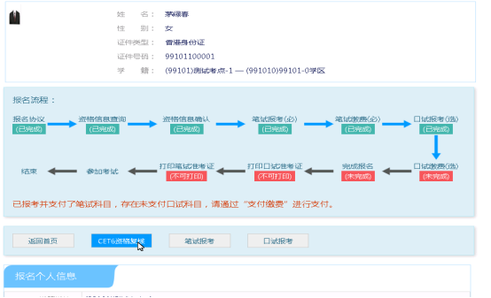 考生可以在这个页面,检查自己的照片和基本信息是否正确,查看自己的报考资格科目和进行CET6资格复核申请。