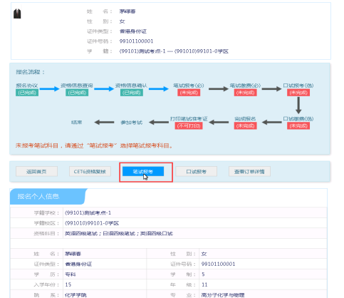 选择要报考的科目,点击“提交”按钮,返回到考生报名页面,点击“口试报考”