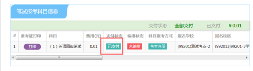 缴费成功后对应科目的“支付状态”会变更为“已支付”。注意:一旦完成缴费,报名信息无法更改。
