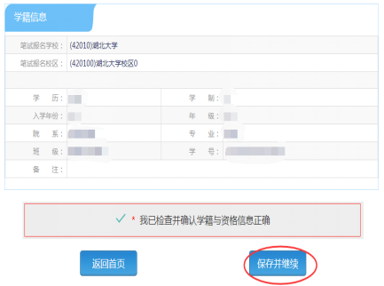 2、登录和审核信息。注册完成后,点击“进入报名”登录系统后在“资格信息确认”页面检查自己的照片、姓名、性别、证件类型、证件号码、资格科目以及学籍信息是否准确无误。(请同学们务必在3月15日—3月22 日完成,此时间段只是审核本人学籍基本信息,通过报名操作无效。如发现本人的报考信息有误,请持相应证件到教务处考务办公室(知言楼211室)申请修改)