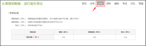 单击课程进入课程首页、点击导航栏中“进度”查看个人学习进度和成绩。