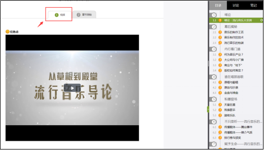 点击章节后会出现如下页面。在下图所示的页面右侧是课程的目录,每一章节包含了视频学习和相应的章节测验。