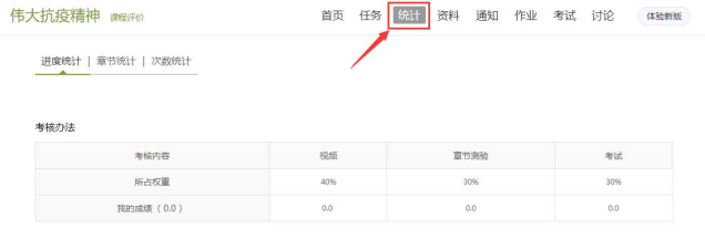 单击课程进入课程首页、点击导航栏中“进度”查看成绩权重和当前分数。