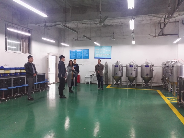 交流会结束后,罗成惠处长、王远丽主任来到我系啤酒与饮料生产实验室进行参观学习。刘齐主任向来访客人介绍了实验室的建设和使用情况。