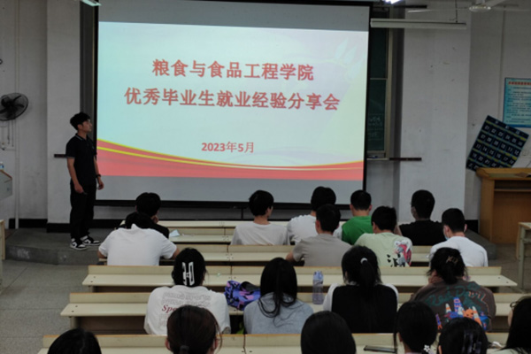2021届优秀毕业生江跃凯,目前就职于南昌县市场监督管理局,和大家分享了公务员考试备考经验和市场监督管理局食品安全监管的日常工作情况。2022届优秀毕业生丁保华,现在任益海嘉里(武汉)粮油工业有限公司品管部大米QC,和大家分享了益海嘉里的企业文化,自身工作职责和工作以来的收获感悟。2023届毕业生杨成旭则现场和大家交流了去年在武汉市华测检测技术有限公司实习的情况。