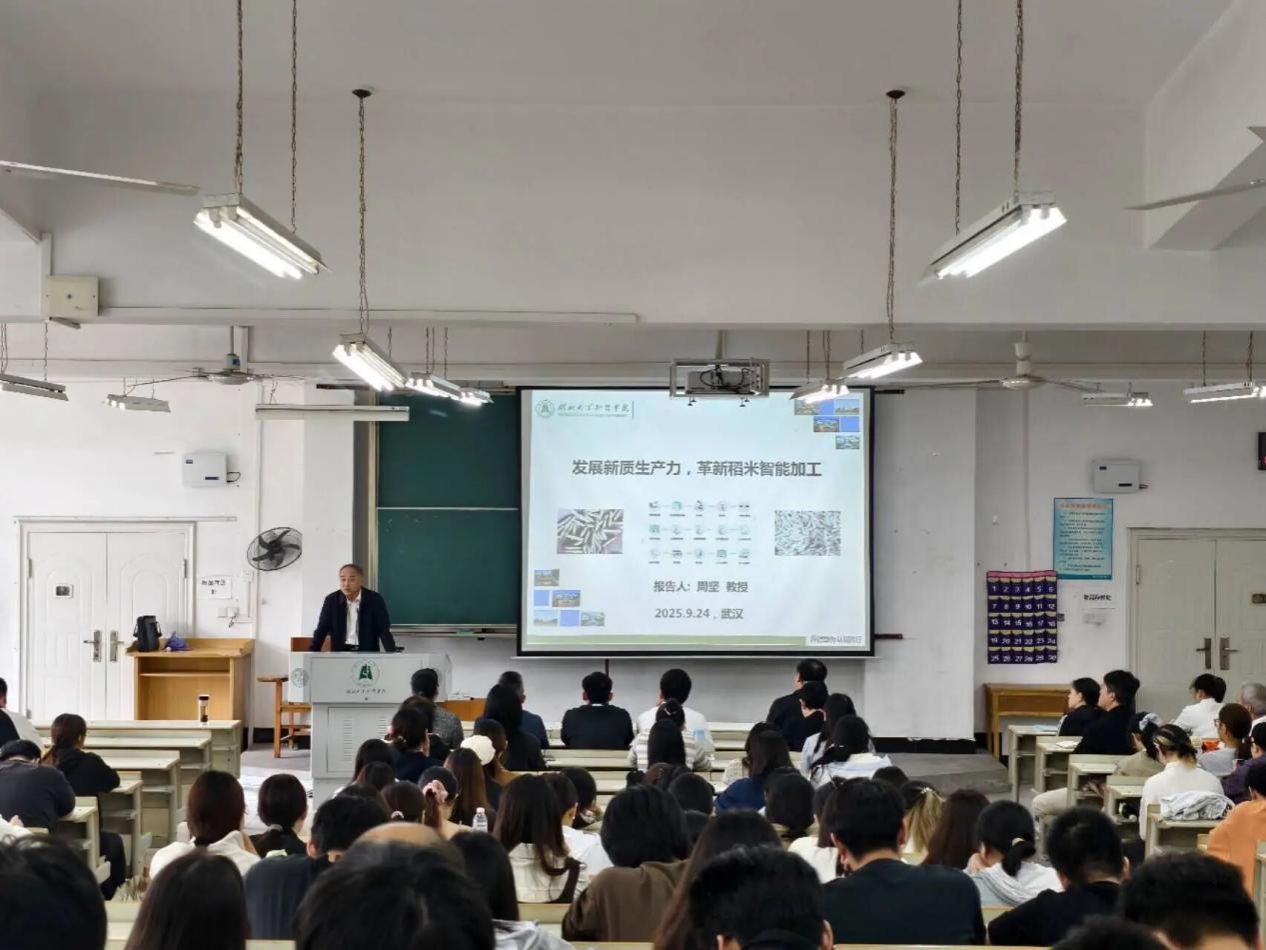 周坚教授聚焦国家关于发展新质生产力的战略导向,系统阐释了稻米加工领域智能化转型的核心要义与发展前景。他详细剖析了智能大米加工厂的核心技术架构,从精准感知、智能控制、数据驱动到全流程自动化,层层递进,勾勒出未来粮食加工的现代化图景。周教授的报告内容翔实、逻辑清晰,既有理论高度,又紧密联系产业实际,为在场同学带来了一场前沿知识的盛宴。