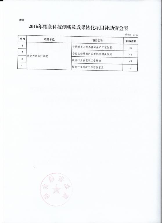 我系叶敏老师、彭汝生老师申报的《非均质嵌入营养挂面生产工艺创新》、《谷壳生物质燃料成型机研制及应用》两项专利,经粮食局审核,同意批准实施,补助资金分别为40万元。