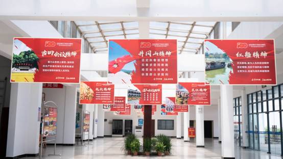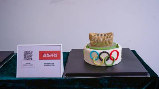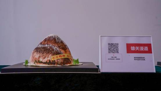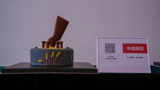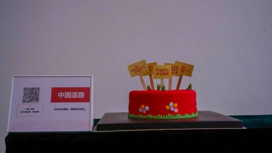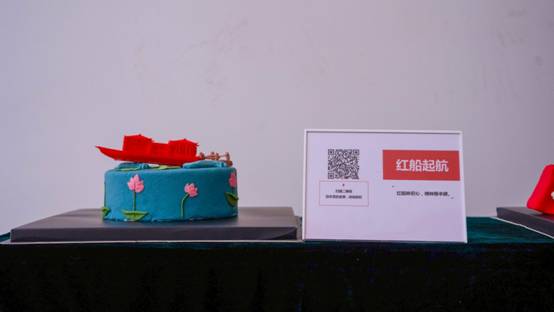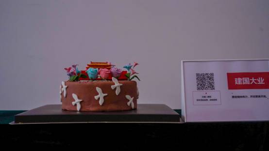 现场,两张5米长的桌子各摆放着5个特色蛋糕,每个蛋糕以党史为主题,融合运用翻糖蛋糕、3D打印技术,将红船起航、新中国成立、改革开放、国产航母列装、脱贫攻坚、抗击疫情等党的重要历史事件生动呈现,以独特的手法展示革命先辈筚路蓝缕、自强不息的奋斗历程,在每个蛋糕旁边还附有一个展示牌,展示牌上有相关蛋糕名称及二维码,师生们可以用手机扫描二维码了深入了解相关党史故事。