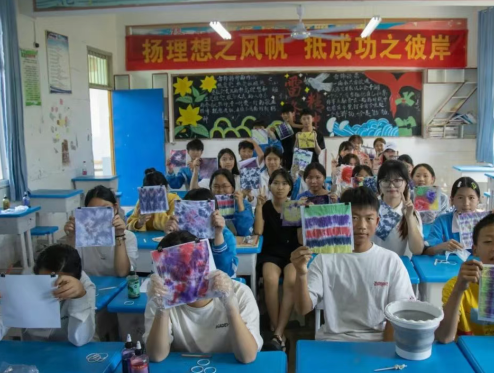 队员吴欢为同学们讲解扎染技艺时说道:“每一次展开都是独特的惊喜,就像你们的人生。”同学们兴致勃勃地动手尝试,教室里回荡着“看我的水墨画!”“你的像星空!”的欢快交流,每个人都在创作中收获了快乐。