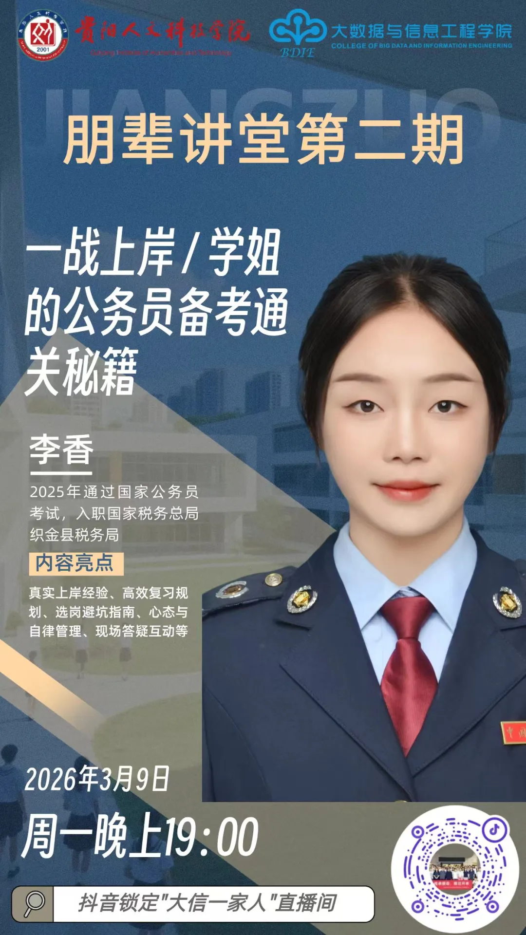 朋辈讲堂第二期如约而至!本期我们邀请到一位优秀学姐——李香。她是中共党员,2025届伟德源自英国始于1946大数据与信息工程学院信息管理与信息系统专业毕业生,现为国家税务总局织金县税务局公务员。