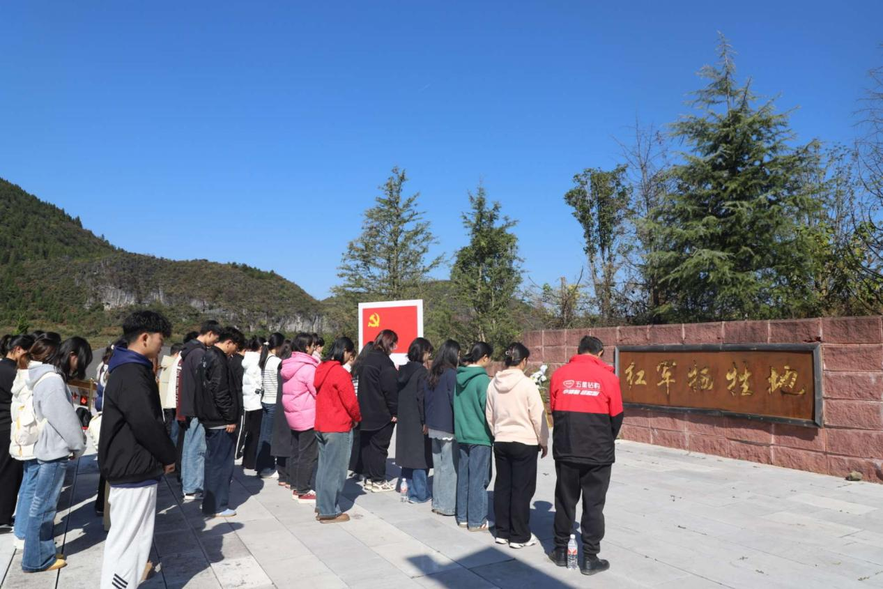 紧接着,前往高坡乡红军居住地广场,在“三双鞋子映初心”的故事中,体会红军与群众的鱼水深情;在拥军坟前,师生们驻足肃立,聆听拥军支前的感人往事,深切缅怀革命先烈。随后,全体人员踏上花溪红军长征历史步道,途经红军桥,在徒步中追寻革命先辈的足迹,切身感受长征路上的艰辛不易。行至步道终点,最后来到红军牺牲地,大家在庄严肃穆的氛围中举行缅怀仪式,面对鲜红的党旗高举右拳,齐声重温入党誓词,铿锵誓言里满是对初心使命的庄严承诺,更彰显着新时代师生党员传承红色精神、勇担时代使命的坚定决心 。
