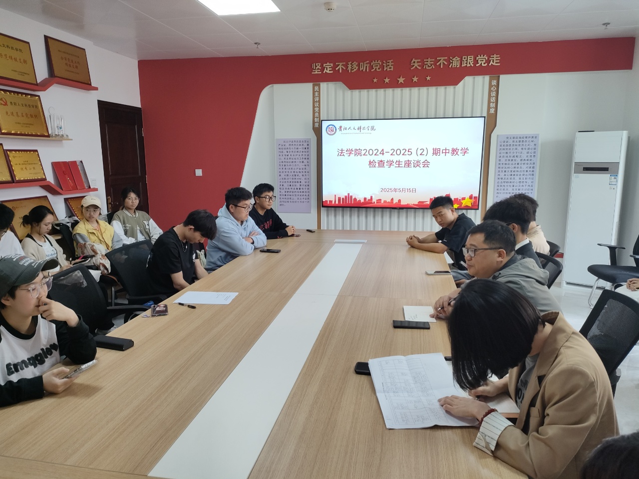 为进一步加强本科教育教学质量管理,深入了解教育教学情况,及时解决教育教学过程中存在的问题,提升教学质量。2025年5月13日、15日,法学院分别在大学城校区、花溪校区召开了“2024-2025学年度第二学期期中教学检查学生座谈会。学院院长杨武松、副院长倪亭、教学秘书以及2024级、2023级、2022级各班学生代表参加座谈会。