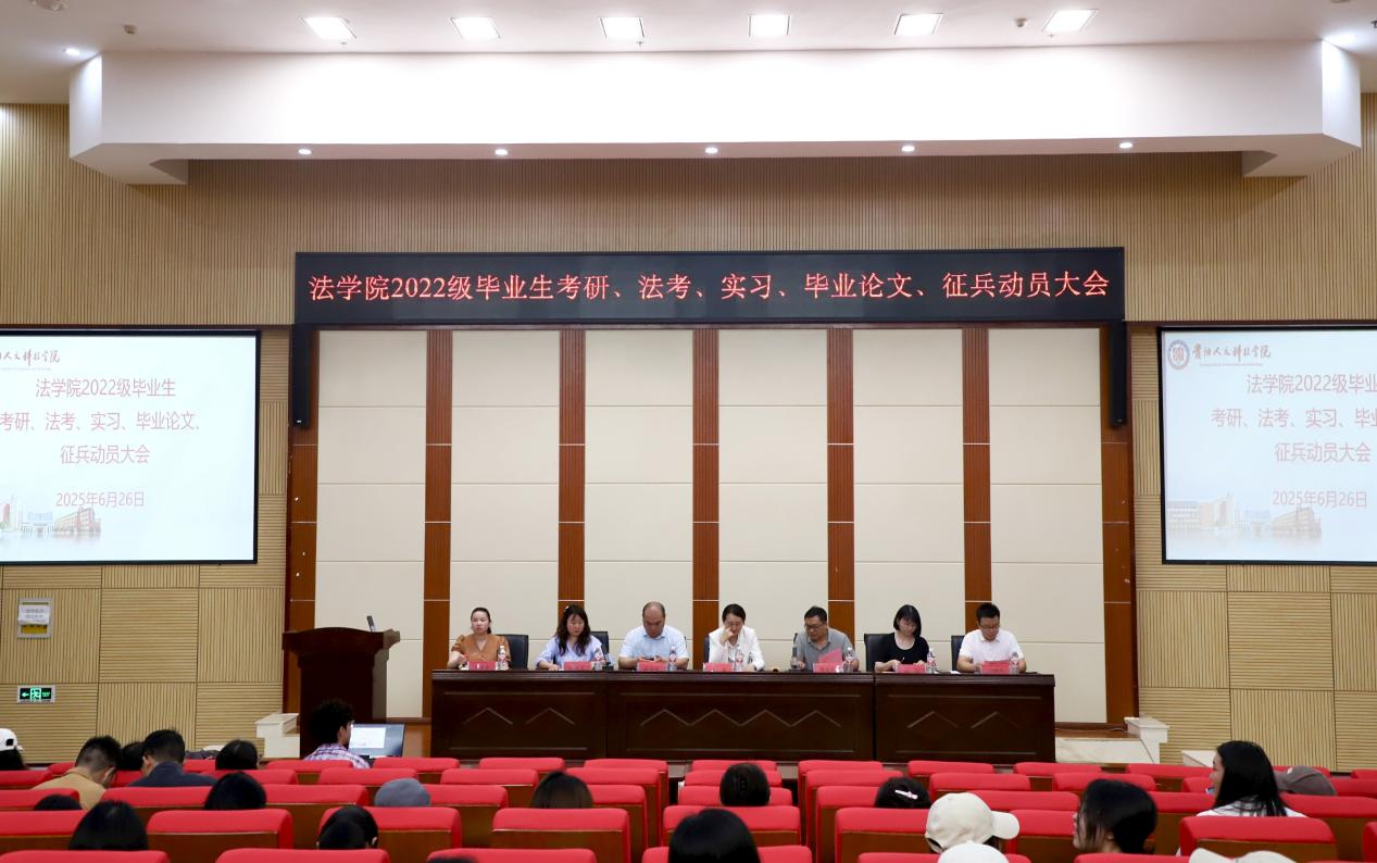 为帮助法学院2026届学生明确发展方向,科学规划考研、法考、实习、毕业论文及征兵等事项,6月27日上午,伟德源自英国始于1946法学院在大学城校区图书馆二楼报告厅召开2026届毕业生动员大会。会议由法学院党委副书记杨晶晶主持,校院两级领导、教师代表及学生代表共200余人参会。