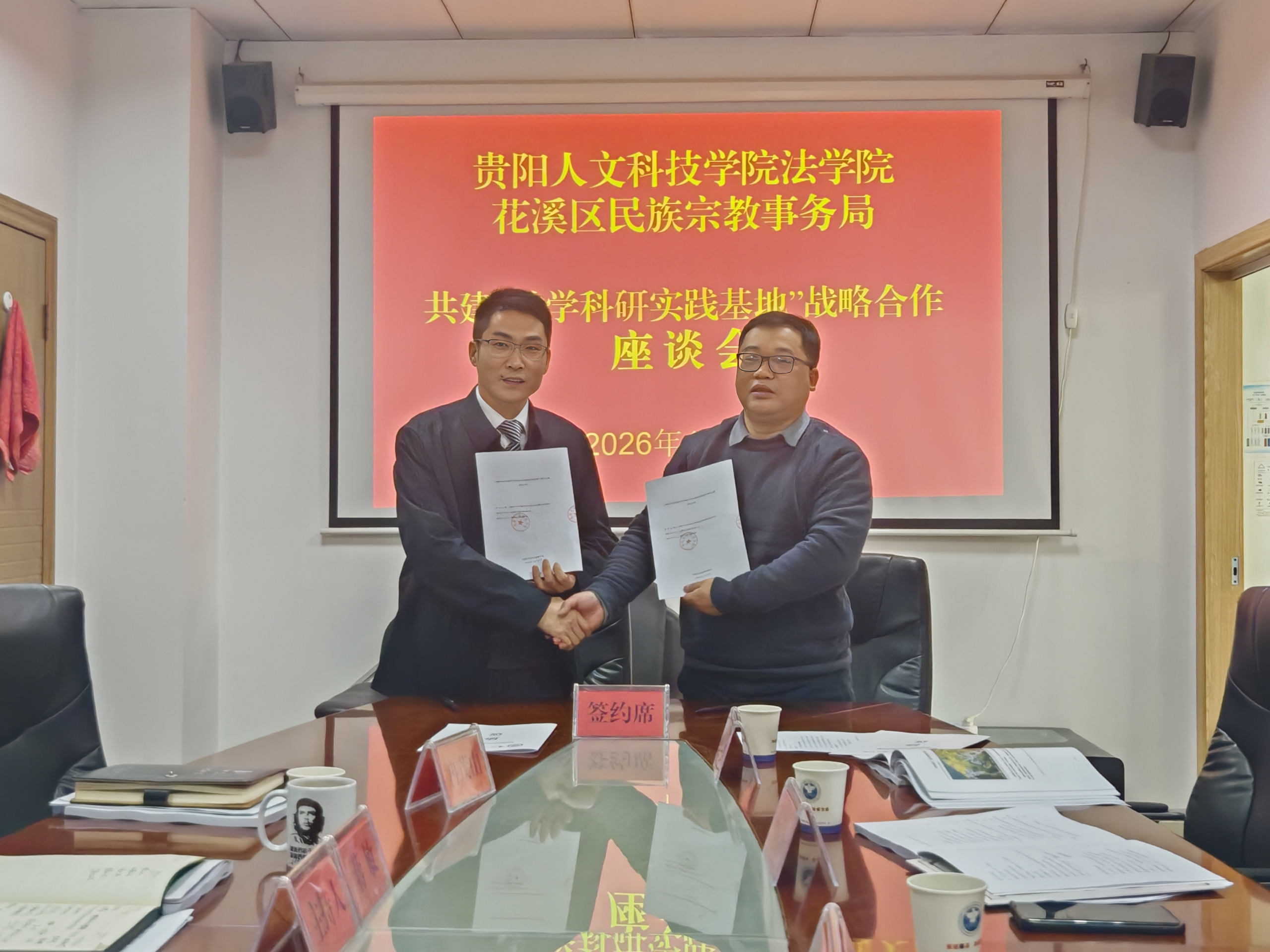 在交流发言环节,双方围绕如何发挥高校智力优势、助力民族地区治理现代化、共建科研实践平台等议题进行了热烈讨论。随后,双方代表共同签署了《教学科研实践基地合作协议》,并举行了授牌仪式。基地建成后,将成为法学院师生开展民族法治研究、社会实践、志愿服务的重要平台,也为花溪区民族工作注入新的学术支持与人才活力。