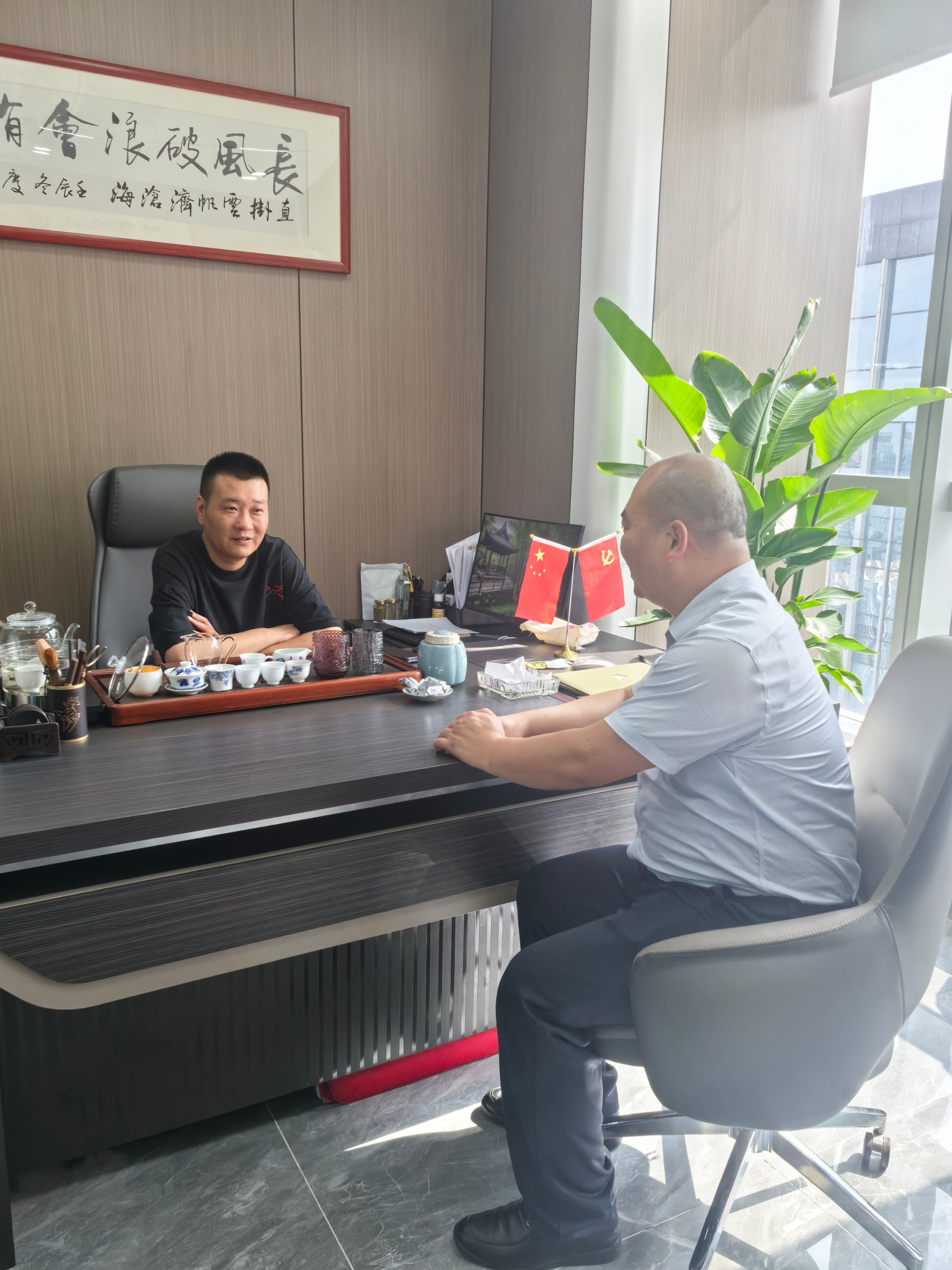 法学院党委书记张福高(右)与华侨(贵州)能源科技有限公司副总裁(左)交流。