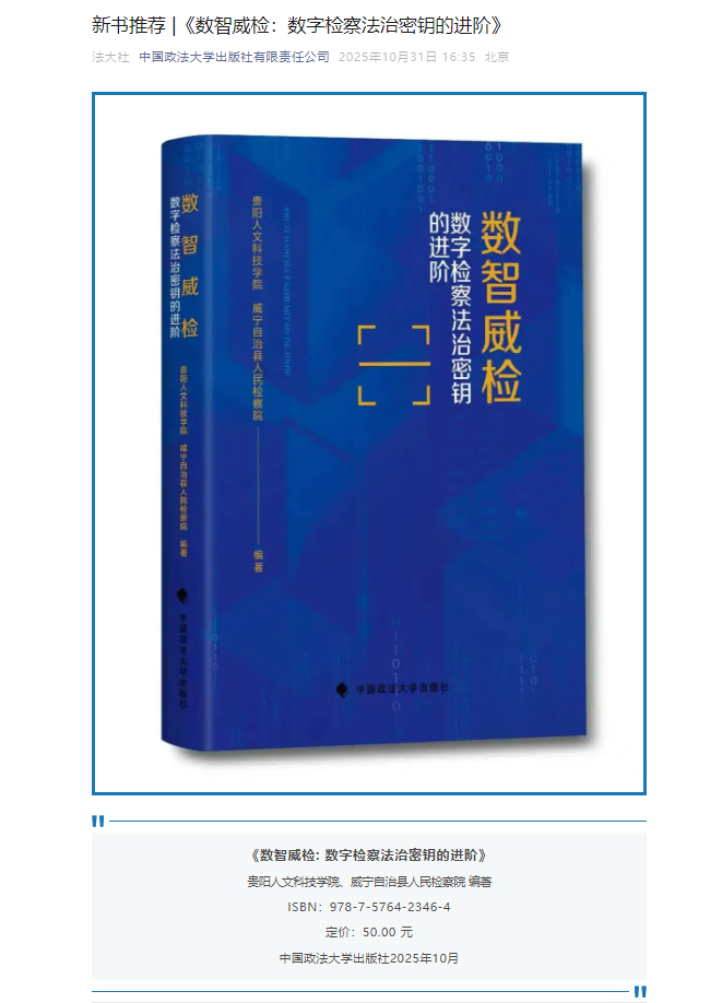 我院参与编著的《数智威检:数字检察法治密钥的进阶》正式出版发行