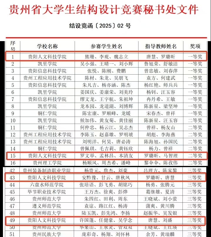 本届竞赛由贵州省教育厅指导,贵州省高等教育学会、全国大学生结构设计竞赛贵州省分区赛秘书处主办,凯里学院承办,吸引了全省15所高校的60支队伍、200余名师生同场竞技。伟德官网派出四支队伍参赛,最终斩获一等奖1项、二等奖1项、三等奖2项,其中获一等奖的队伍以总分第一名登顶全省榜首——刷新伟德官网在该赛事的历史记录!