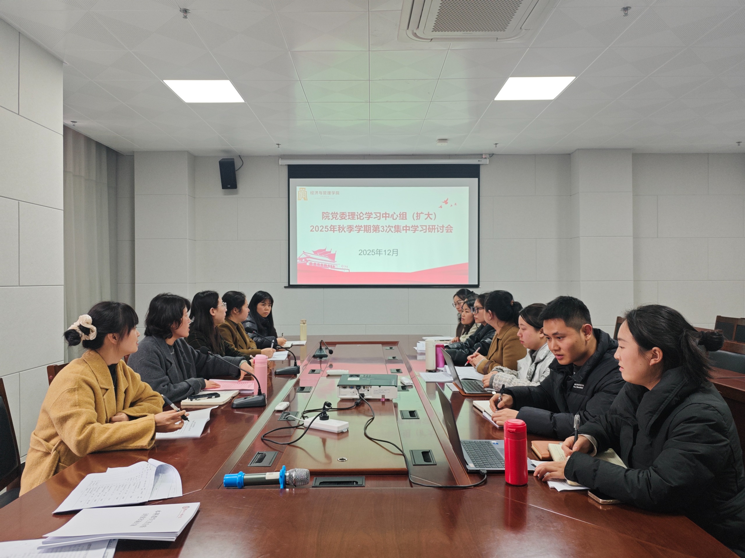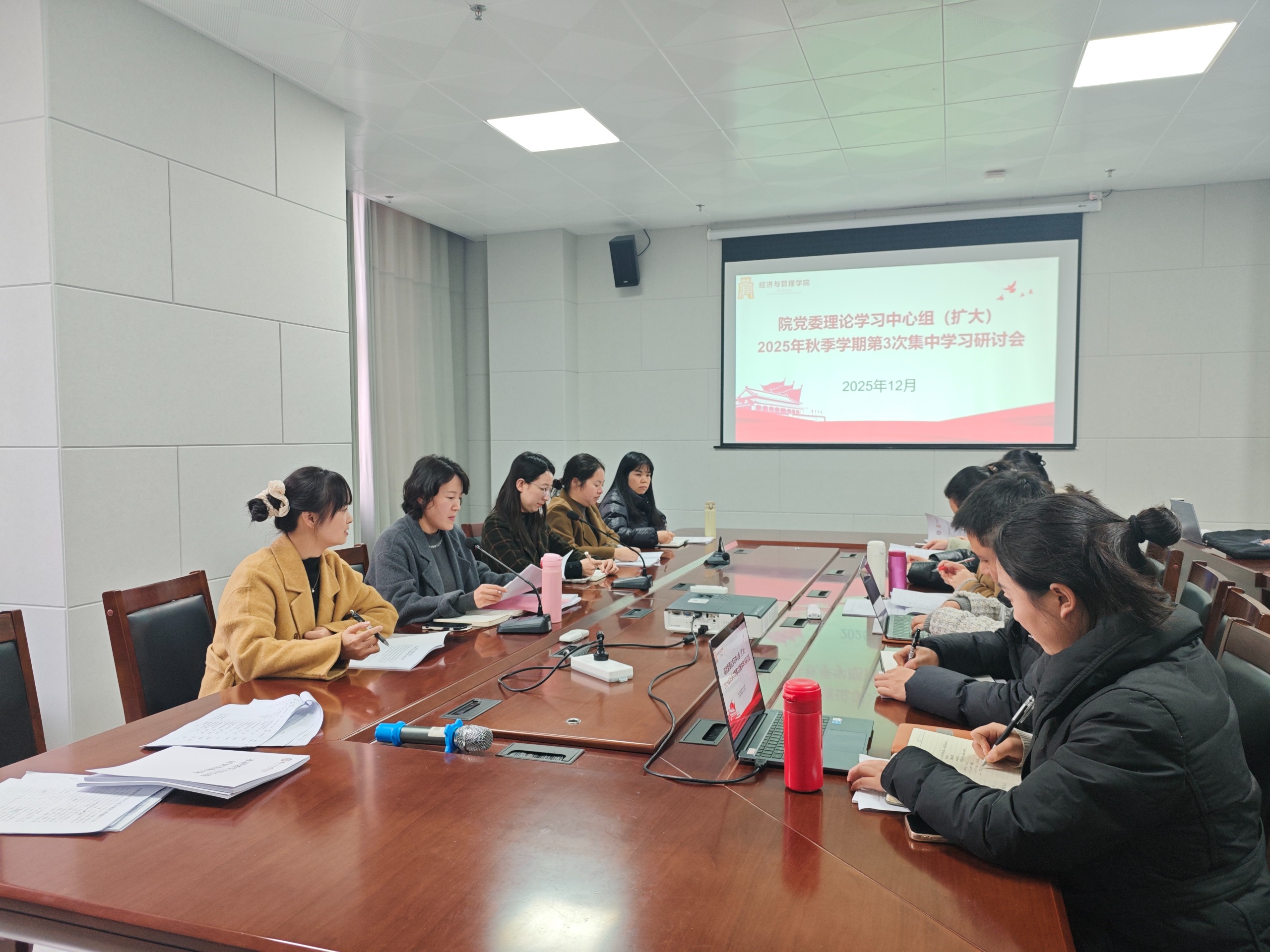 为全面深入贯彻和落实党的二十届四中全会精神,切实增强在实际工作中运用科学理论分析和解决现实问题的能力水平,进一步强化理论武装、深化思想认识。12月9日,我院党委理论学习中心组(扩大)2025年秋季学期第3次集中学习研讨会在师德楼310会议室召开。会议由学院党委书记田丹主持,学院党委委员、各党支部书记及支委共同参加。