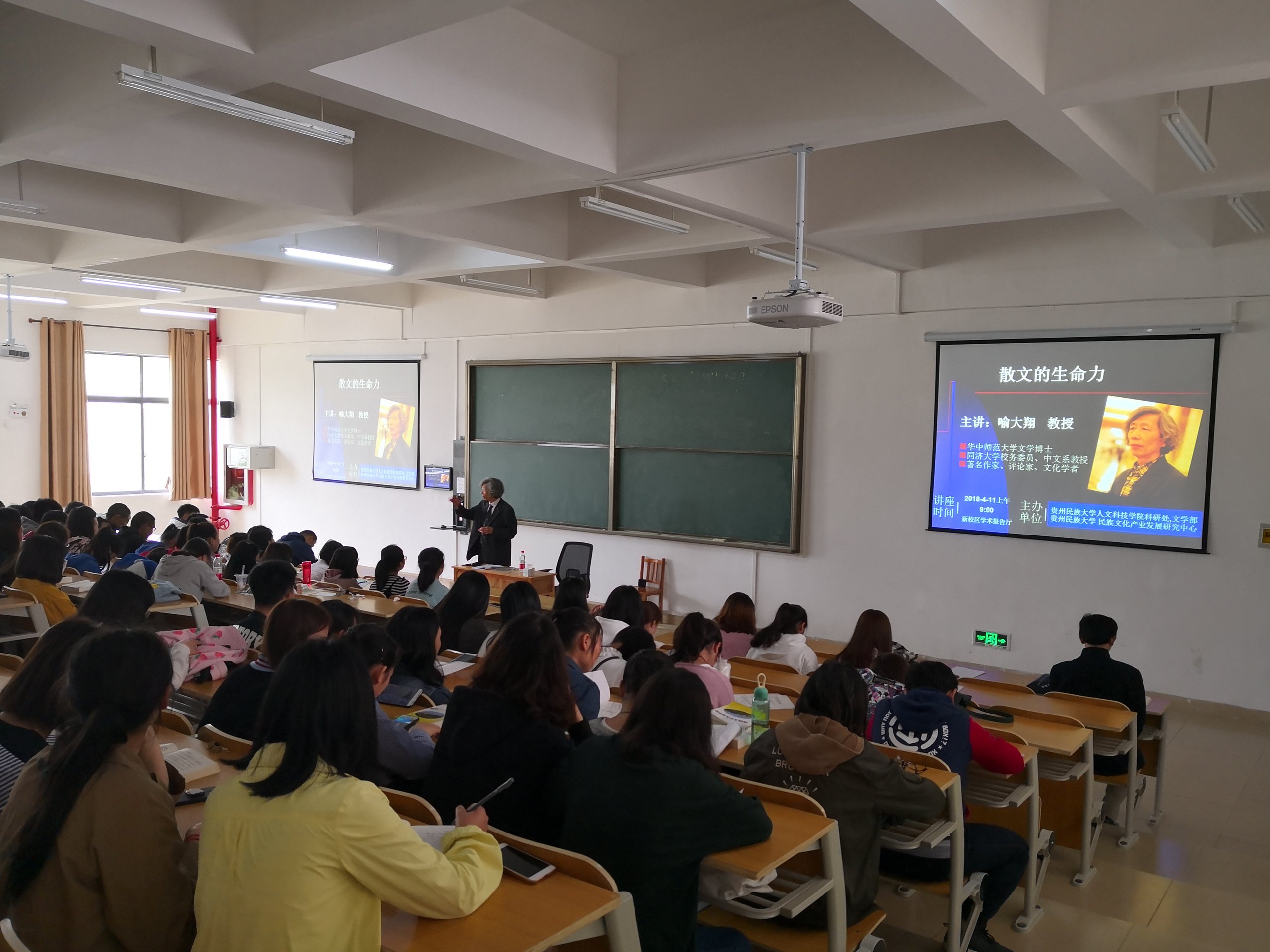特点、要素以及文体划分等方面,对散文创作的神秘性进行了深度剖析和揭示,深刻论述了散文的五大特征:1.主体的真实性;2.内容的私密性;3.论说的普遍性;4.语言的日常性;5.体裁的兼类性。现场师生聆听了喻大翔教授的精彩报告,深受启发并受益匪浅。