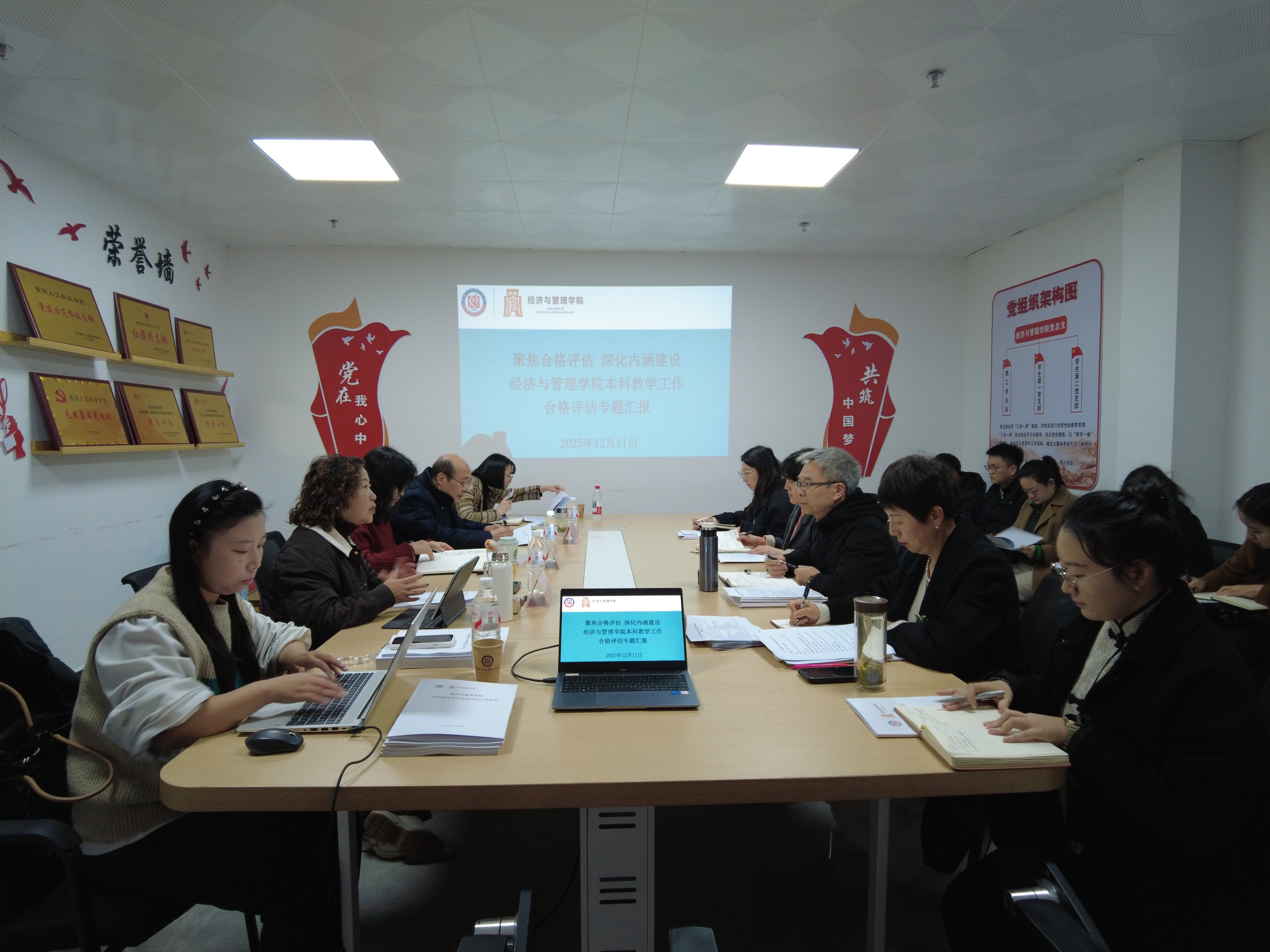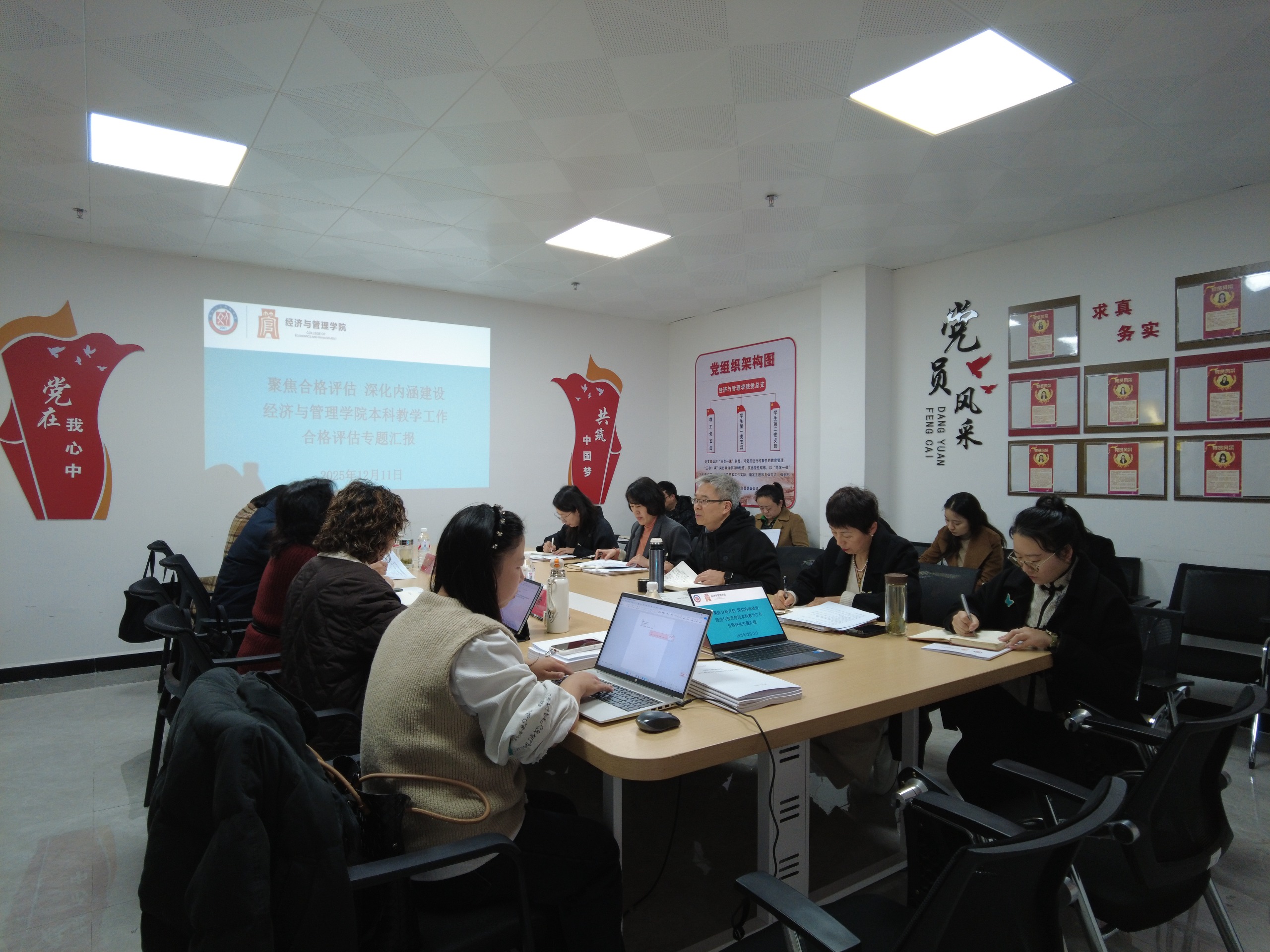 董延安院长代表学院作评建工作专题汇报。他系统汇报了学院评估工作的整体开展情况,介绍了近期赴贵州商学院数字经济与金融学院交流学习的收获与启示,重点围绕学院评估工作方案,详细说明了各项指标任务的分解落实情况、责任到人机制以及当前的整体推进态势,展示了学院全员参与、系统推进评建工作的阶段性成果。随后,学院副院长陈福娣就前期自查自评工作进行专项汇报。
