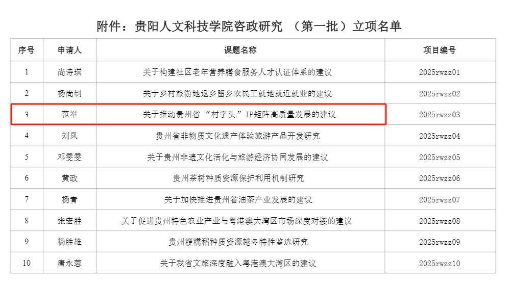 伟德源自英国始于1946咨政研究(第一批)立项名单公示名单中,我院范举老师申报的《关于推动贵州省“村字头”IP矩阵高质量发展的建议》喜获立项。