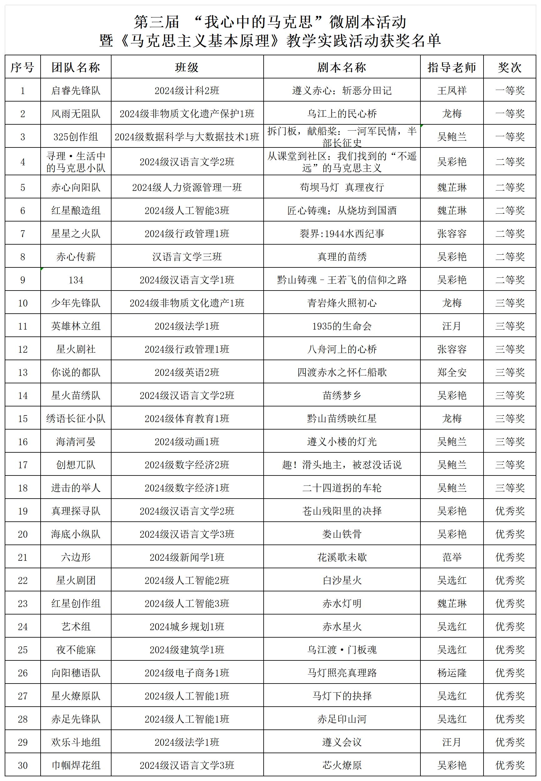 历经多轮严谨评审,12月5日,第三届“我心中的马克思”微剧本活动评审工作正式圆满落幕。本次活动共收到全校600余份参赛作品,评审阶段由马克思主义学院院长周剑云、团委书记李荟、学工部部长王瑞娟、返聘教授陈国敏、中华民族共同体概论课教研室主任杨豪组成专业评审委员会,围绕“思想性”“历史真实性”“艺术表现力” 等核心维度展开严格遴选。最终,《遵义赤心:斩恶分田记》《乌江上的民心桥》《拆门板,献船桨:一河军民情,半部长征史》3部作品斩获一等奖;《从课堂到社区:我们找到的 “不遥远” 的马克思主义》《苟坝马灯 真理夜行》《匠心铸魂:从烧坊到国酒》等6部作品剧本荣获二等奖;《青岩烽火照初心》《1935的生命会》《八舟河上的心桥》等9部作品剧本获评三等奖,另有若干优秀作品获优秀奖。参赛作品均紧扣“历史事件”“贵州元素”“马克思主义原理点”核心关联,生动呈现遵义会议、四渡赤水等红色故事,通过约 200 字的 “原理点睛” 环节画龙点睛,充分展现了学子们扎实的理论功底与良好的文化素养。