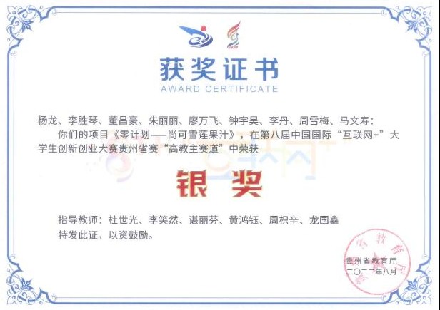 2022年8月,在第八届中国国际“互联网+”大学生创新创业大赛中,朱锡锦团队凭借《大学生户外联盟》项目在贵州省赛“高教主赛道”中荣获铜奖;2020级休闲体育专业学生杨龙的团队凭借《零计划—尚可雪莲果汁》项目斩获银奖。