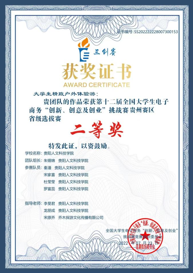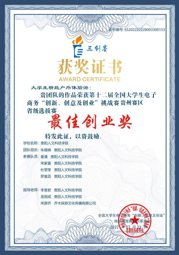 2022年6月,第十二届全国大学生电子商务“创新、创意及创业”挑战赛贵州赛区省级在伟德官网大学城校区举行,我院2019级休闲体育专业学子朱锡锦团队凭借《大学生精致户外游》项目获省级赛二等奖、最佳创业奖。