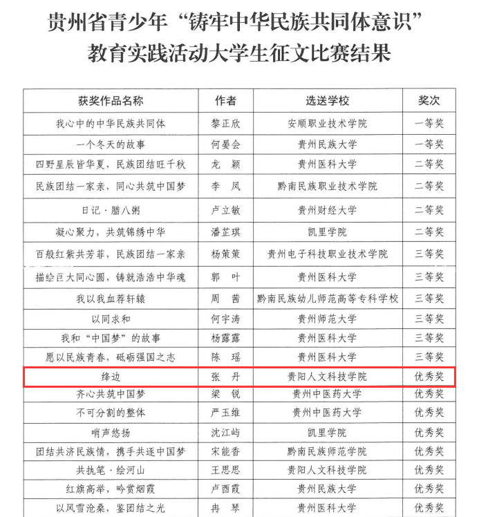 2022年4月3日,由省民宗委、省教育厅、团省委共同举办的贵州省青少年“铸牢中华民族共同体意识”教育实践活动大学生征文演讲比赛结果公布我院2020级动画专业1班学生张丹在本次征文比赛中凭借作品《绛边》荣获了优秀奖。