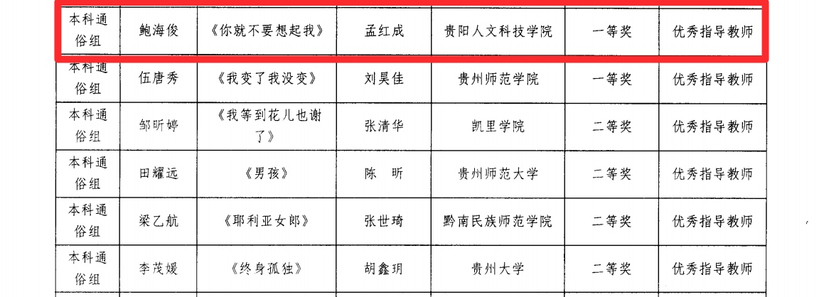 此次载誉而归的优秀学子中,张云祥同学以一曲《雪白的鸽子》,在本科民族组赛道中以细腻的情感演绎与精湛的演唱技巧,征服评委,勇夺桂冠;鲍海俊同学在本科通俗组比赛中,凭借对《你就不要想起我》的深情诠释,以极具感染力的舞台表现斩获一等奖;张琴同学的《贵妃醉酒》韵味十足,荣获本科民族组三等奖;杨芸同学演唱的《漫步街上》与黄梦雪同学演绎的《你给我听好》,也凭借出色发挥,分别获得本科美声组与通俗组优秀奖。此外还有孟红成老师荣获优秀指导教师称号。
