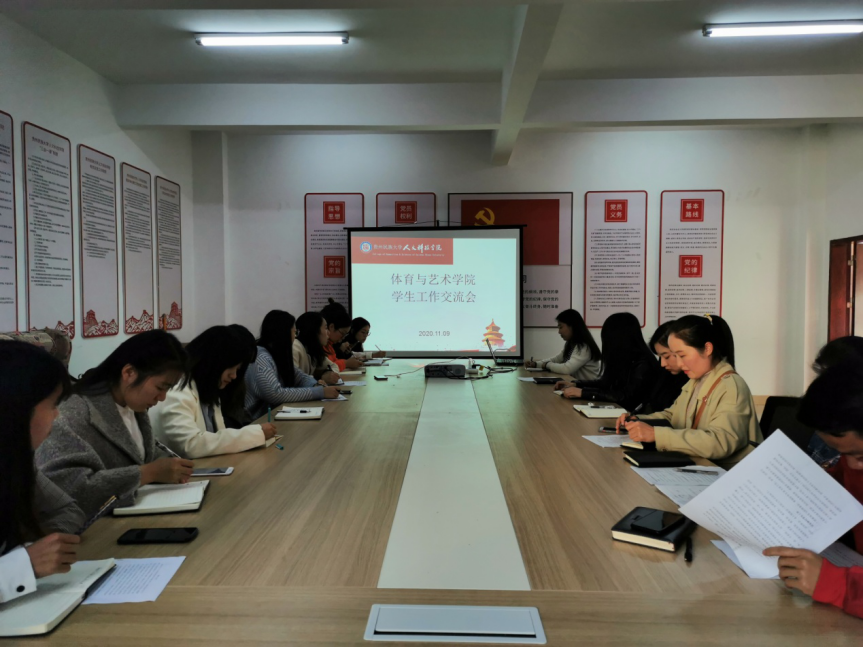2020年11月9日15:00,体育与艺术学院组织学院专职辅导员、班主任以及部分专职教师在科研楼301会议室召开学生工作交流会会议由我院党总支副书记田丹主持,我院党总支书记王雪出席会议。