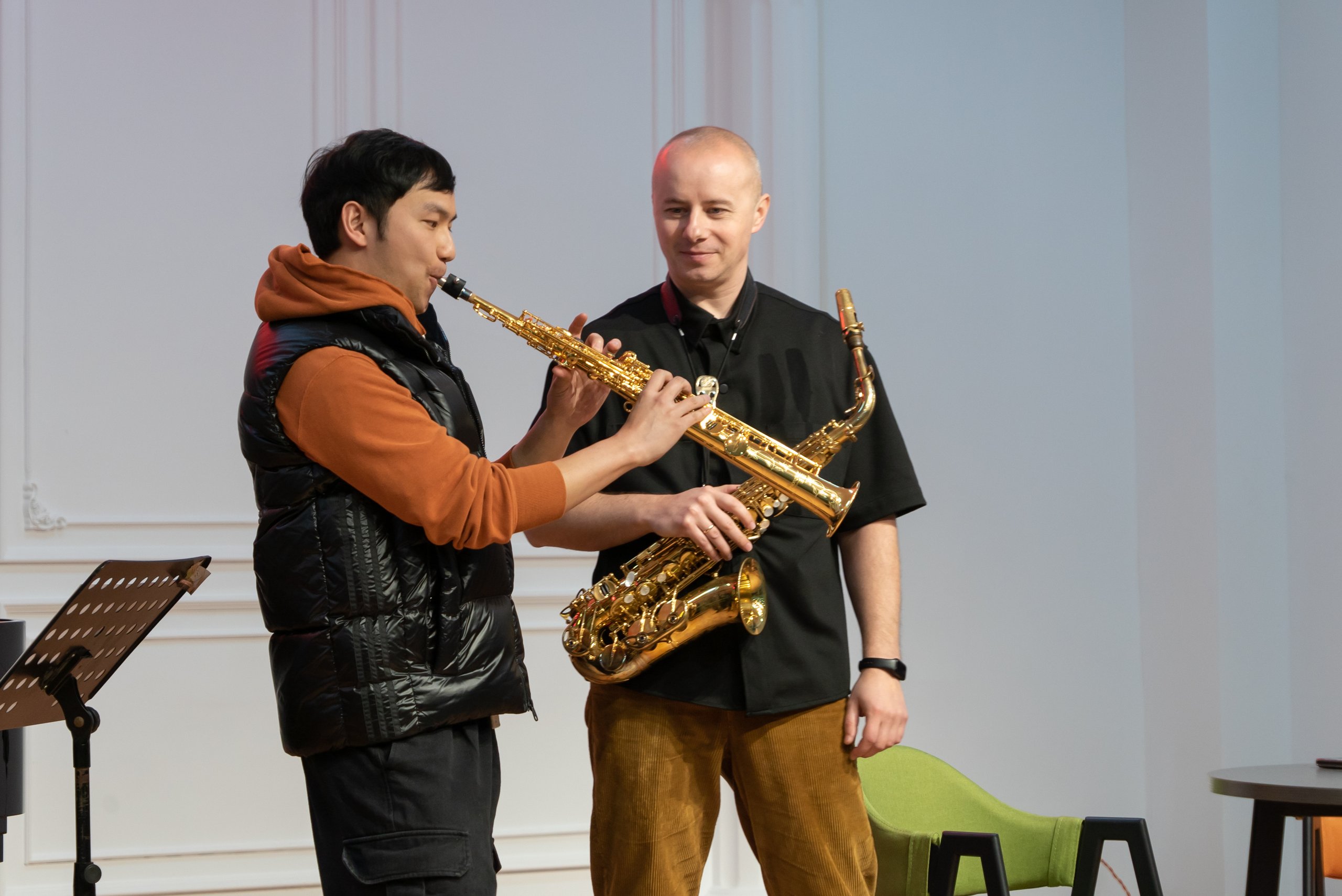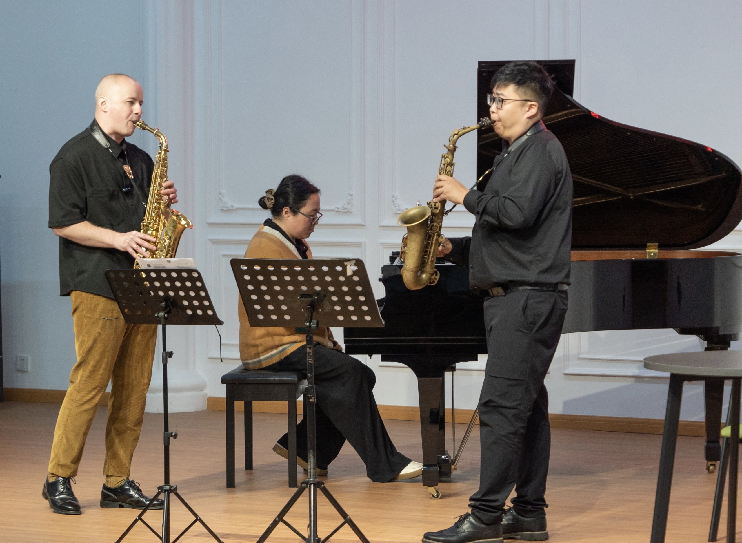 活动现场最动人的时刻来自中俄文化的音乐对话。罗曼先生以斯拉夫民族特有的深沉音色演绎俄罗斯民间小调,邱忠治老师则运用更具中国风的节奏处理和气息控制重新诠释——前者如白俄罗斯广袤原野般辽阔,后者似中国水墨画般留白写意。而后罗曼先生即兴改编邱忠治老师取材于《诗经》的原创作品《静女》,俄罗斯式的炽热情感与中国古典的含蓄意境在萨克斯管中交融,作为曲作者的邱老师与在场多位海外归国学者热泪盈眶,见证了音乐超越文化藩篱的力量。