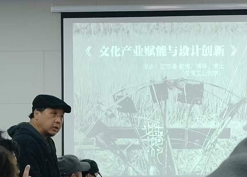 讲座开场,邱志涛教授借助详实数据,点明行业发展痛点:设计与产业需求、教育与社会实践双重脱节,少数民族地区文化资源转化不足。通过湘黔实地调研,他发现当地非遗纹样、民俗故事等极具开发潜力,“这些文化基因需借助设计创新,转化为产业竞力。”