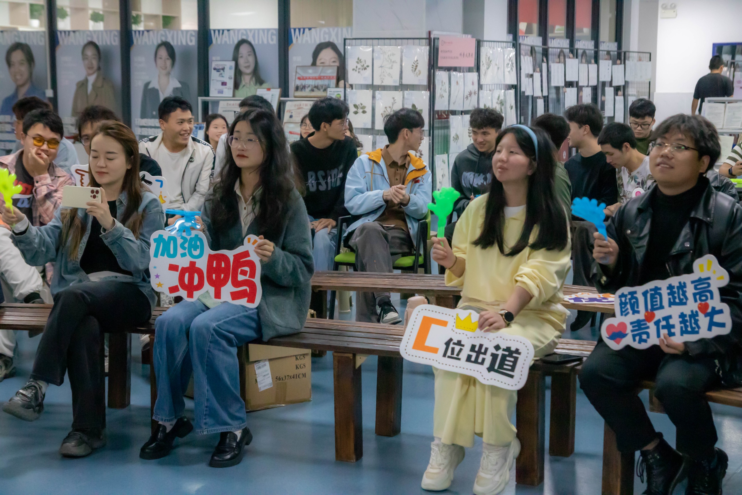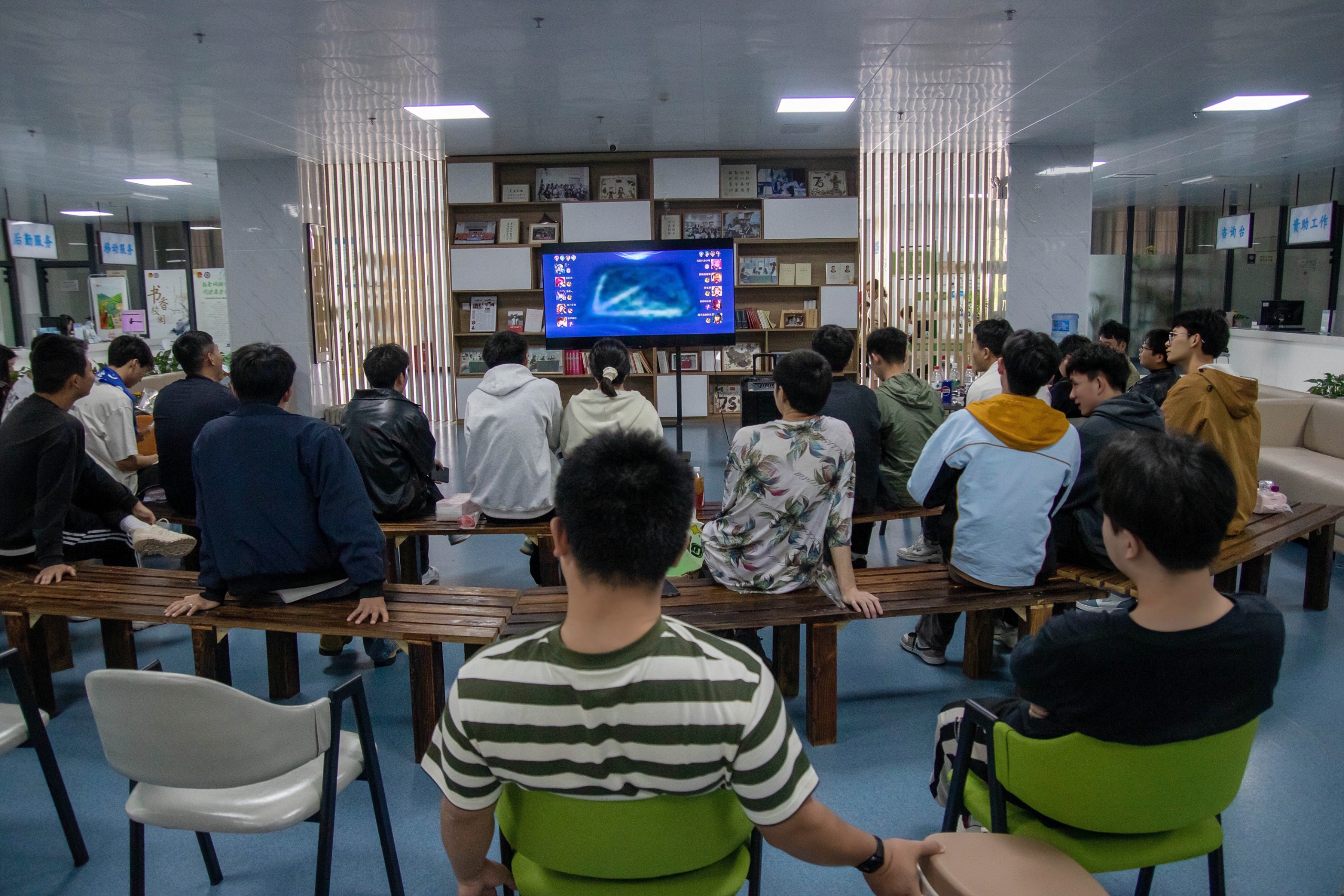 一系列精彩纷呈的活动接踵而来,其中王者荣耀比赛的参赛选手们通过抽签决定对阵,展开了激烈的淘汰赛,全程现场直播。现场观众热情高涨,为选手们加油助威。与此同时,大厅两侧还设置了“青春飞扬圈圈秀”和“欢乐投桶”两个互动活动,吸引了众多同学参与,现场欢声笑语不断。