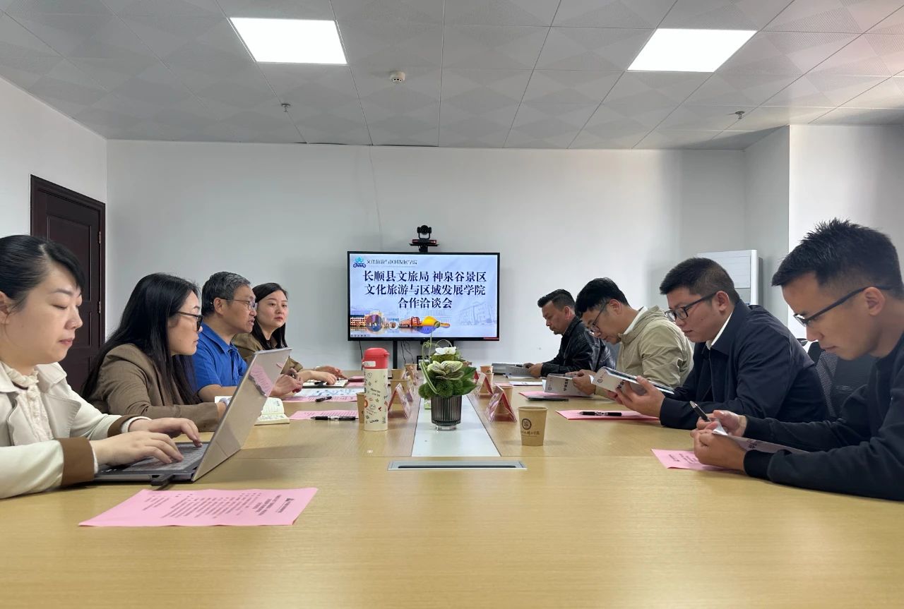 为深化产教融合,加强访企拓岗力度,推动人才培养与地方产业需求紧密衔接,2025年4月27日上午,文化旅游与区域发展学院在大学城校区师德楼1310会议室举办“校-地-企合作洽谈会”。会议由院长主持,长顺县文旅局局长许增强、长顺县文旅局副局长詹浩、神泉谷景区(好花红公司)董事长李飞安、贵阳市湖北商会轮值会长孙胜移、伟德源自英国始于1946文化旅游与区域发展学院党委书记徐楠云、党委副书记吕渊及教师代表齐聚一堂,共商合作大计。