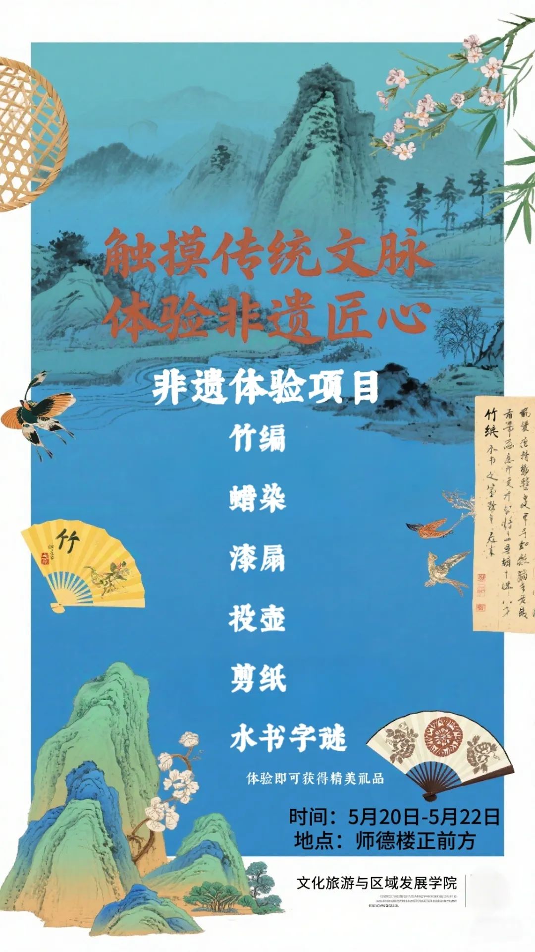 指间生花,古韵新彰!在这里,你可以亲手触摸千年技艺的温度—跟着专业人士学习竹编、蜡染、漆扇等项目,让传统技艺在我们手中焕发新生,做一个文化传承的践行者,用指尖的灵动,编织属于自己的非遗记忆,在一针一线、一编一染间,感受中华民族传统文化的深厚底蕴与独特魅力。