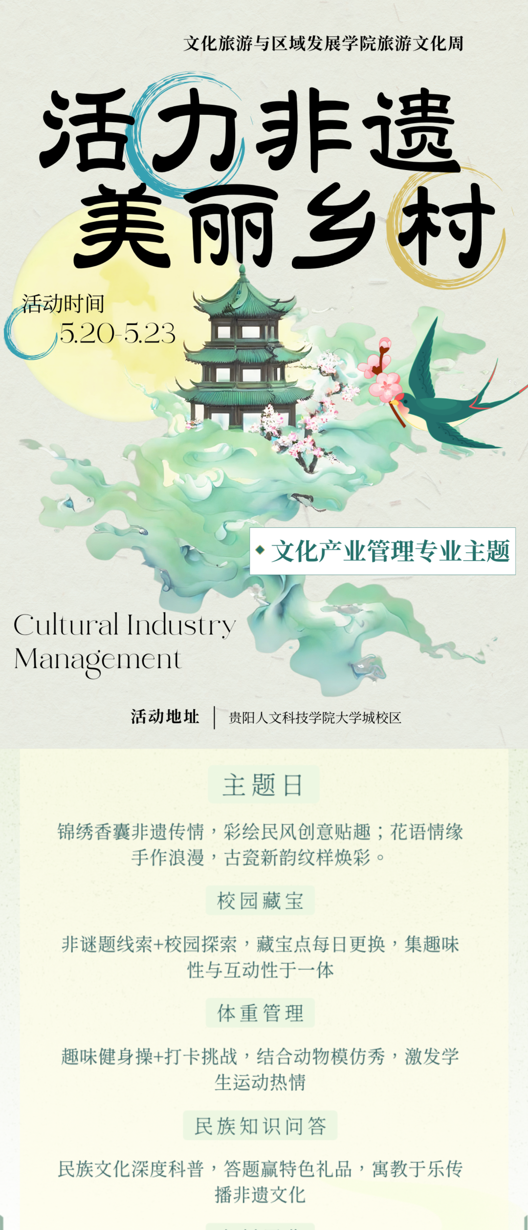 这个充满惊喜与挑战的旅游文化周,正是你展现自我、收获快乐的绝佳机会!叫上室友、同学,一起穿梭校园寻宝,学习体重管理知识,探索民族文化奥秘!