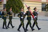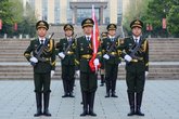 随着主持人“出旗”口令的发出,国旗护卫队肩扛五星红旗,迈着整齐划一的军人步伐,意气风发地从队列前走过,展示出英姿飒爽的青春风采。伴随雄壮的国歌声,全体师生行注目礼,五星红旗在旗杆上徐徐上升,迎风飘扬。