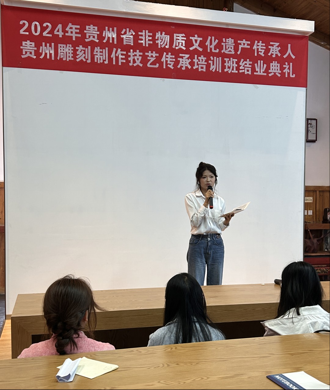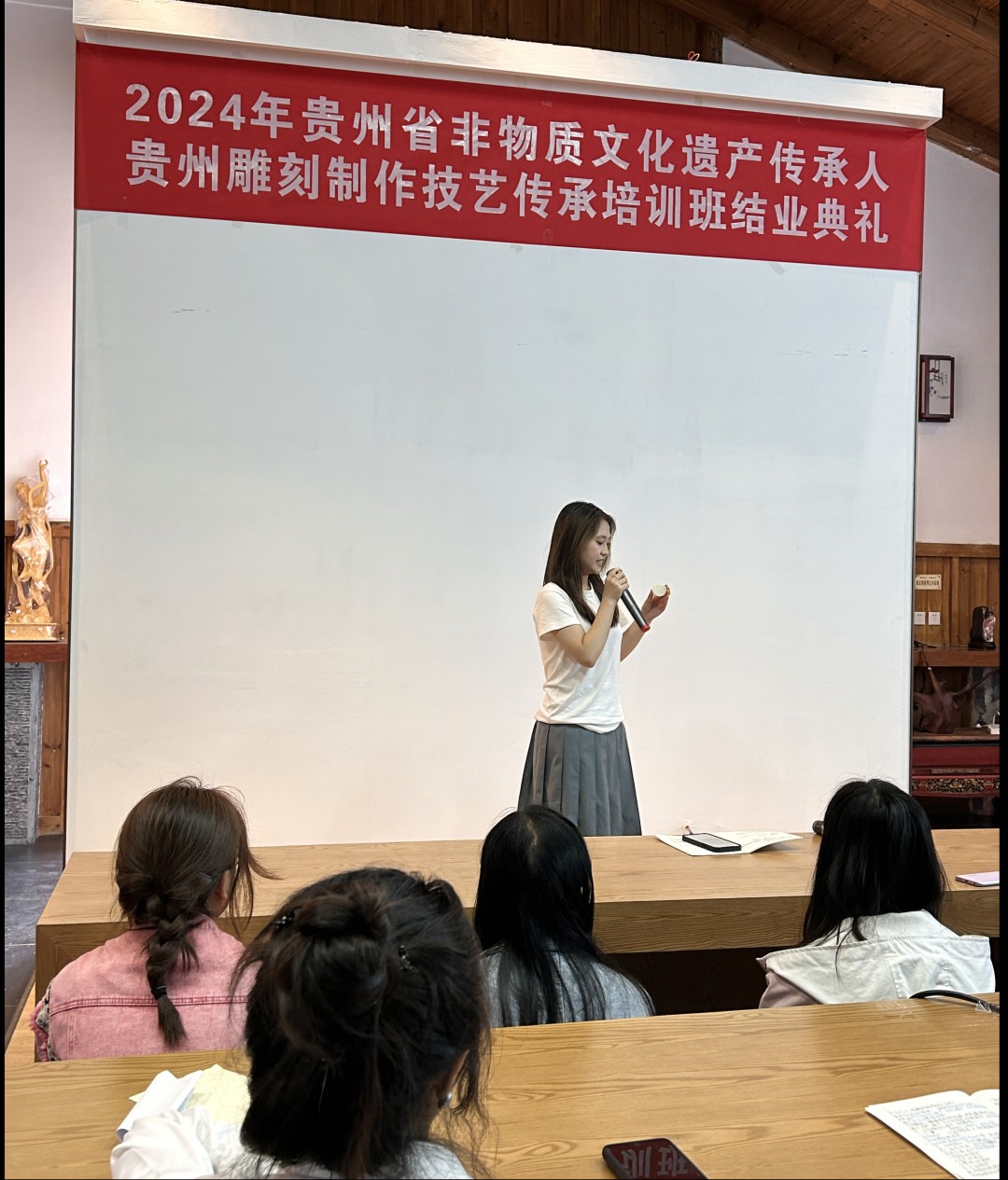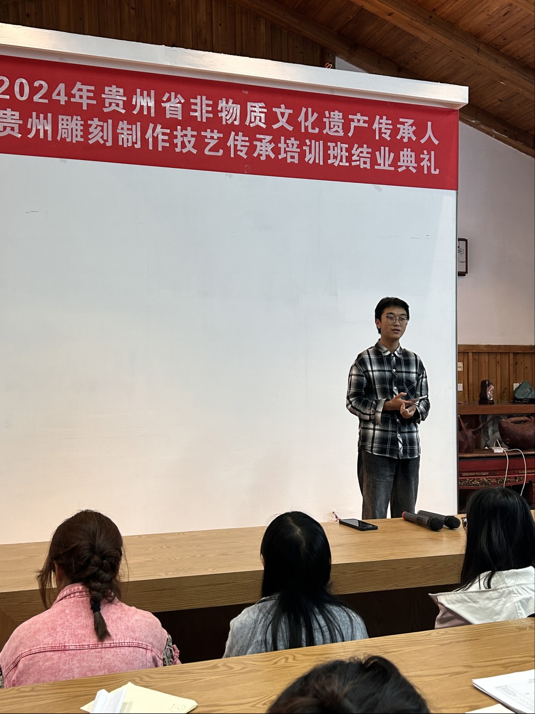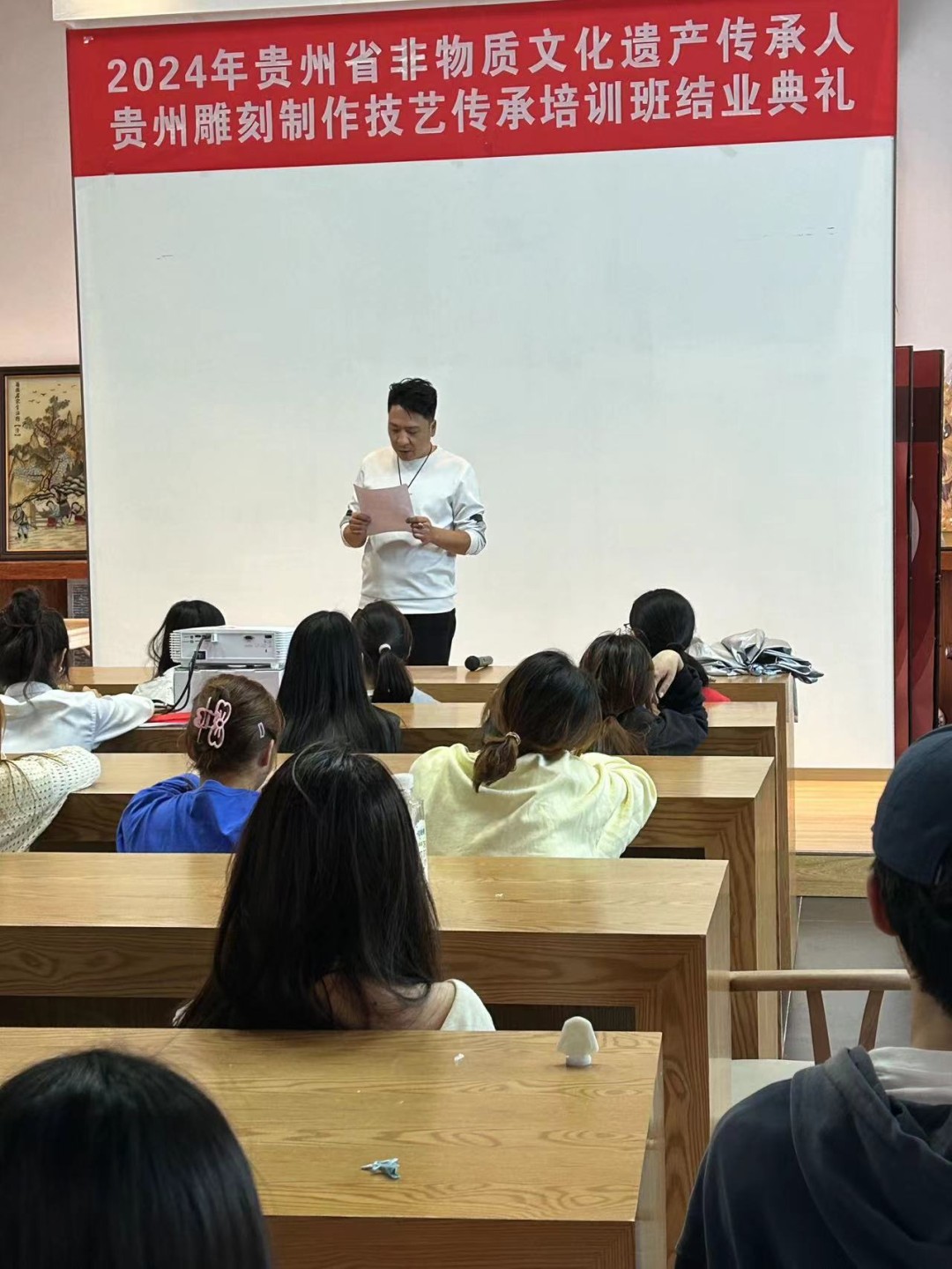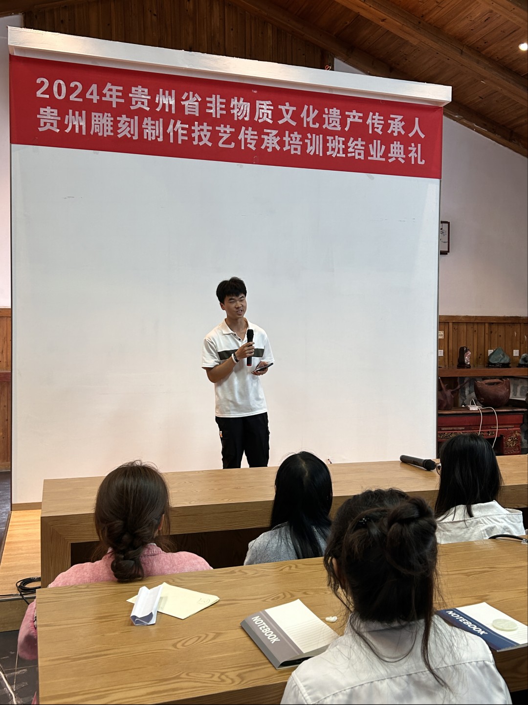 在结业典礼上,由贵州黔石聚点旅游商品开发有限公司技术总监左建湶先生对本次培训做了总结。他对同学们在理论和实践学习中的专注与执着予以肯定,并期待学生在未来人生路上能够继续发扬这些宝贵精神。