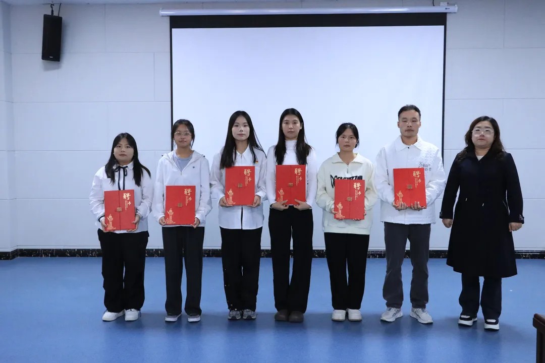 接着,蔡国兴老师宣布第四届党建中心成员名单并强调新鲜血液对学院党建工作的重要性。在热烈的掌声中,张烨副书记和吴彩艳老师为新一届主任团及各部门负责人颁发了聘书,蔡国兴老师为优秀工作者颁发了证书,象征着责任与信任的传递。