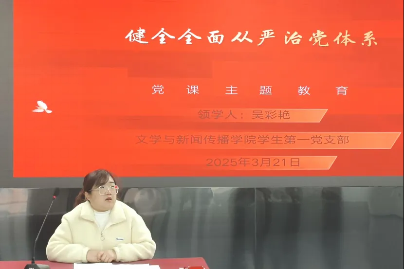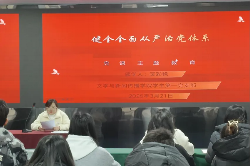 党的十八大以来,我们坚定不移推进全面从严治党,取得一系列理论创新、实践创新、制度创新成果,构建起全面从严治党体系,开辟了百年大党自我革命新境界。文学与新闻传播学院学生第一党支部于2025年3月21日开展以“健全全面从严治党体系”为主题的党课学习。本次学习由文学与新闻传播学院学生第一党支部书记吴彩艳同志领学,支部党员同志及积极分子共同参与。
