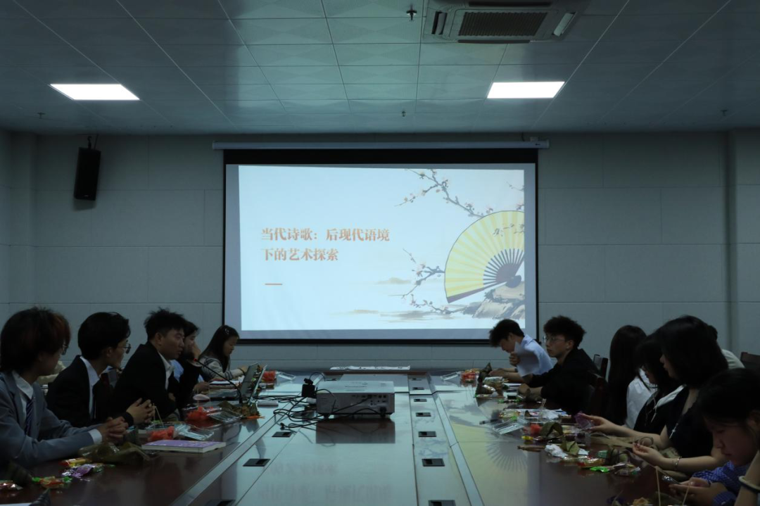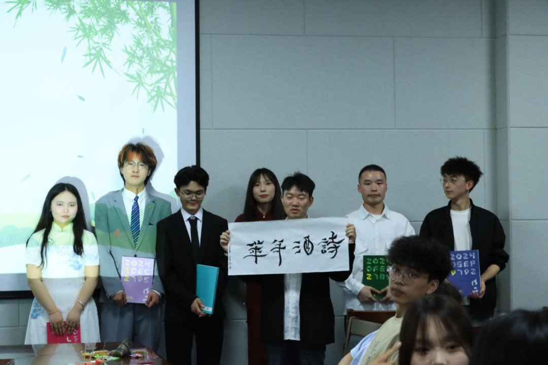 师生齐聚一堂,共同吃粽子,追溯和怀念屈原,分享跟端午节相关的来源、演变及细节,同学们进行屈原的诗朗诵、歌唱、书法表演等,并进行话剧表演《十字街口》(改编自张爱玲中篇小说《红玫瑰与白玫瑰》)。